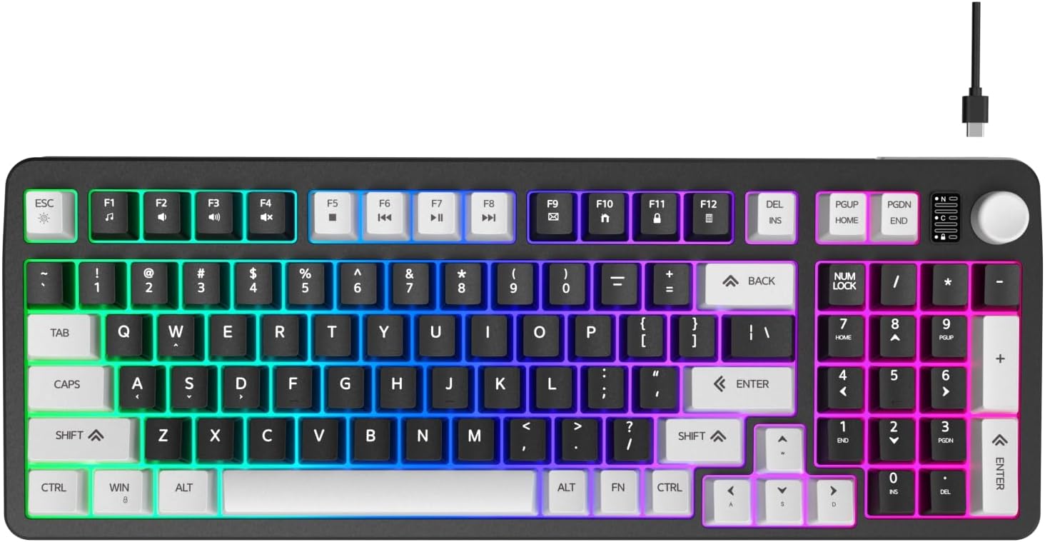 【Mixed Color Keycaps】The rainbow backlit light has breathing and highlight modes.Different colored keycaps and letters create a unique design that can add colors to your desktop.With the volume control knob, you can easily and blindly control the volume during intense games.