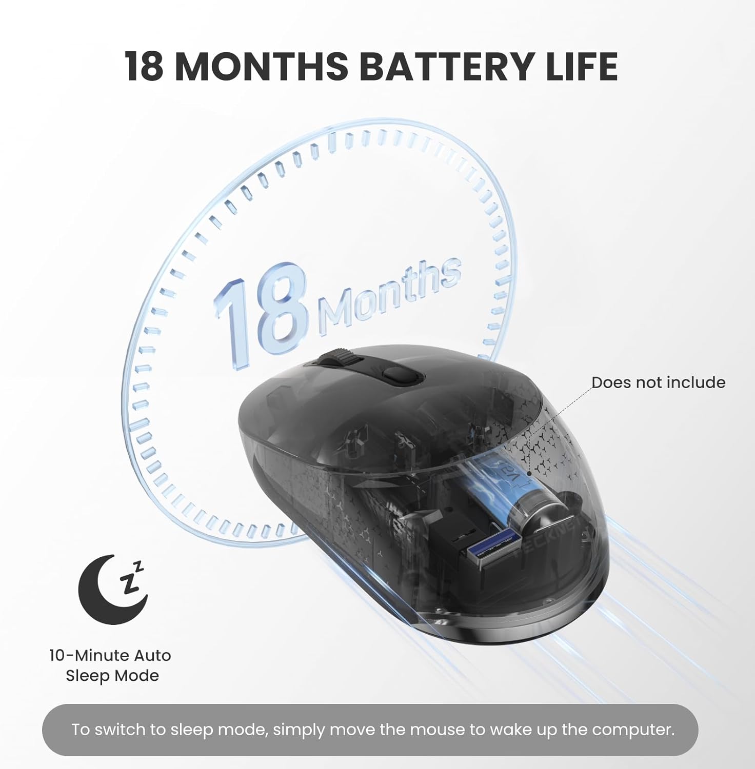 【18 Months Battery Life】Designed with the upgraded independent power switches and sleep modes to minimize battery consumption, the wireless mouse can enjoy up to 18 months of use time with only 1 AA batteriey (not included).