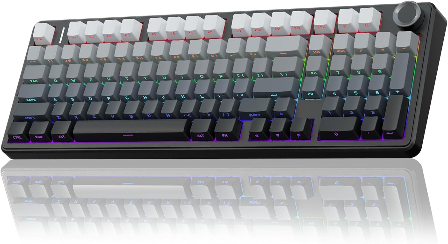 PBT Keycaps and 8000mAh Battery: 99 keys 96% layout compact keyboard can save more desktop space while keep necessary arrow keys and number area for games and work. The rechargeable keyboard built-in 8000mAh large capcacity battery to provide more power and longer battery life. Double shot PBT keycaps, made from two colors material molded into each others, make the keycaps characters maintain the vibrance and saturation, clear and not fade
