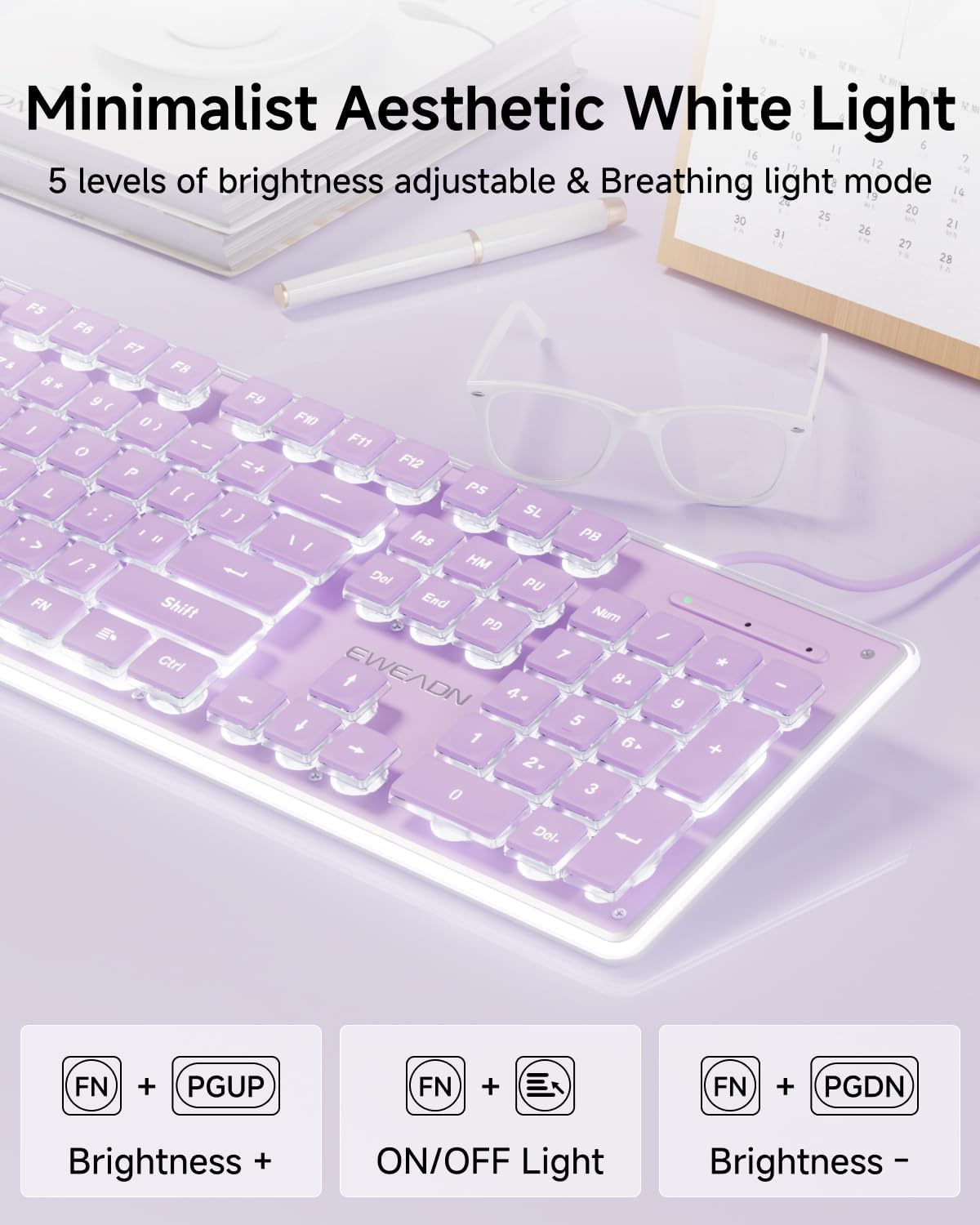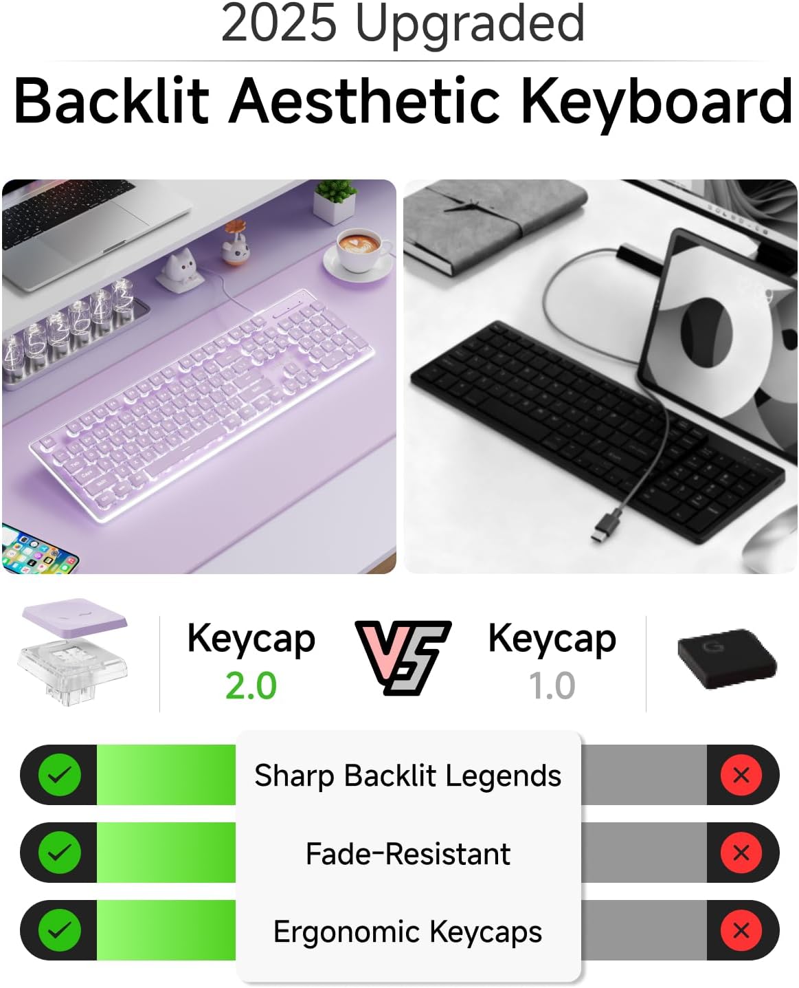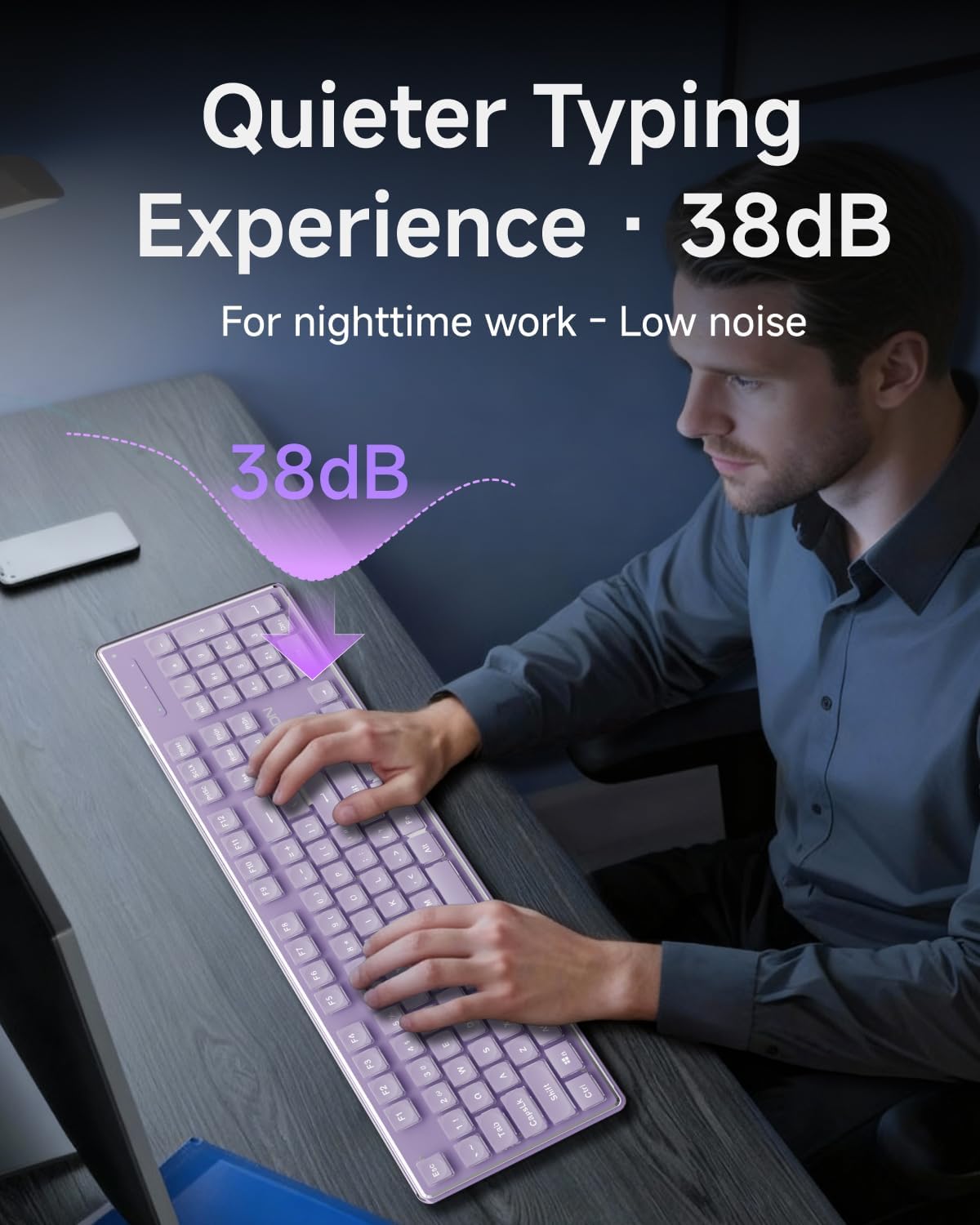 Upgraded Water Drop Pudding Keycaps & Less Noise: The quite computer keyboard uses an upgraded version of the suspended water drop keycaps. The suspension design + pudding structure design makes the silent keyboard more transparent. When the light is on, it looks like an elf. The surface of the keycaps is concave and convex, which is very suitable for your fingertips, making typing or gaming more comfortable and easier. It is also quieter, reducing typing noise by 95%. With wired keyboard, you no longer have to worry about noise interference from libraries, cafes, offices or dormitories