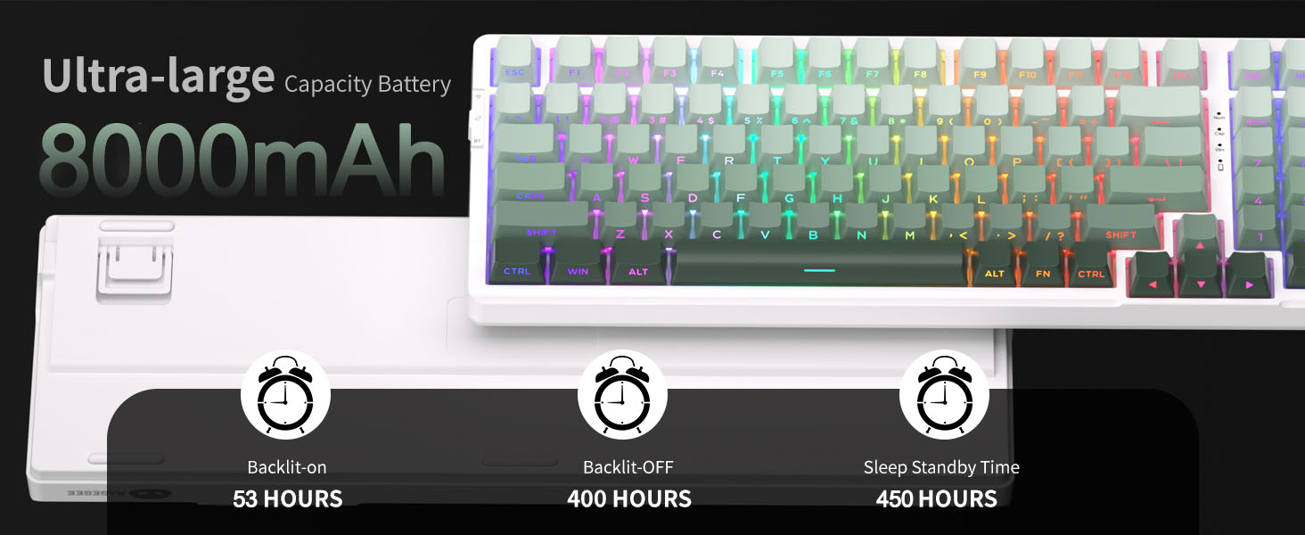 [8000mAh LARGE BATTERY and PBT KEYCAPS]: The 96% layout mechanical keyboard saves more desktop space while retaining function keys and arrow keys for games and work. all 99 keys 100% anti-ghosting, unique side printed durable PBT keycaps, also equipped with a 8000mAh large-capacity battery, support win/mac dual system.