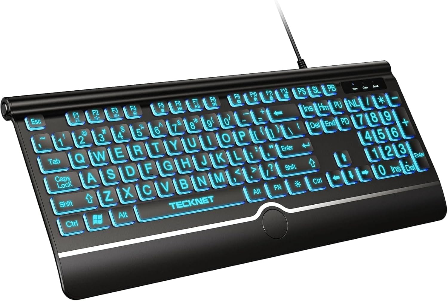 【7-Color Smart Backlight】 The large print backlit keyboard offers 7 lighting modes with three brightness levels. You can also switch between breathing light mode and constant lighting mode to match your preference. Choose white light at medium brightness for enhanced focus during work, or use amber light at low blue light levels to protect your eyes at night. This feature personalizes your workspace while enhancing its aesthetics
